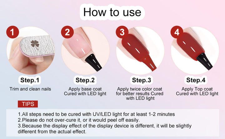 • HEALTHY &EASY APPLICATION: Environment-friendly products with healthy ingredients, low odor, Non-toxic formula,It will need to be cured under a UV / LED light.